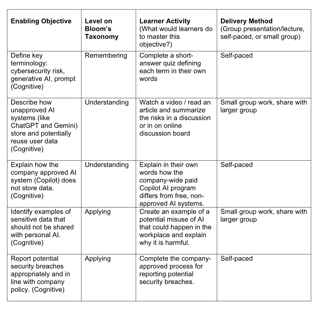 I created this Enabling Objectives Matrix, based on Dr. David Merrill’s Component Display Theory, to set up the outline for the content for a course on cybersecurity and risk mitigation with AI systems.